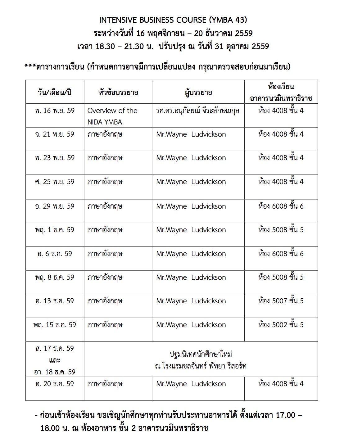 ตารางเรียนวิชาเตรียมความพร้อม (Intensive Business Course) สำหรับหลักสูตร YMBA รุ่นที่ 43
