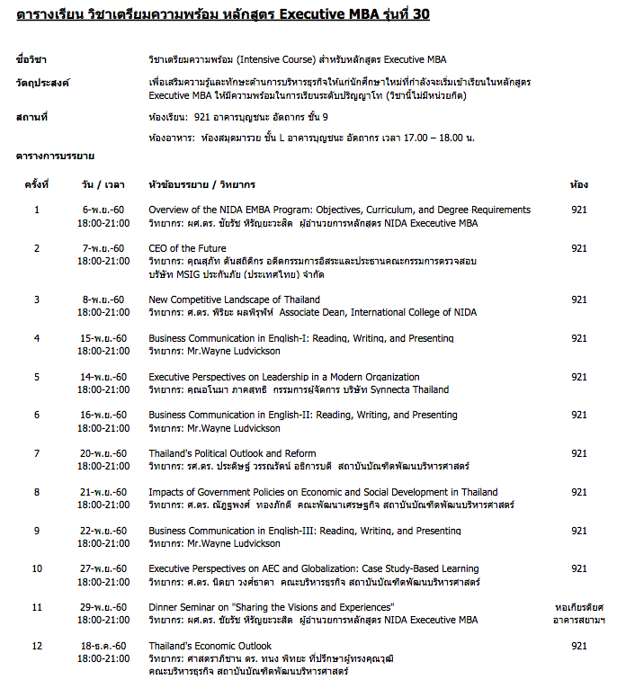 ตารางเรียน วิชาเตรียมความพร้อม หลักสูตร Executive MBA รุ่นที่ 30