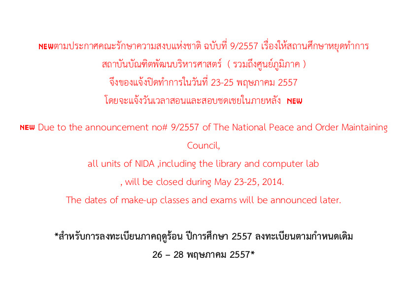 ประกาศปิดทำการในวันที่ 23 – 25 พฤษภาคม 2557