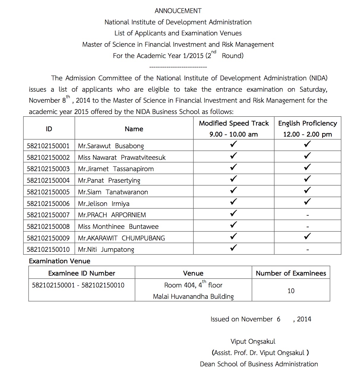 ANNOUCEMENT: List of Applicants and Examination Venues Master of Science in Financial Investment and Risk Management For the Academic Year 1/2015 (2nd Round)