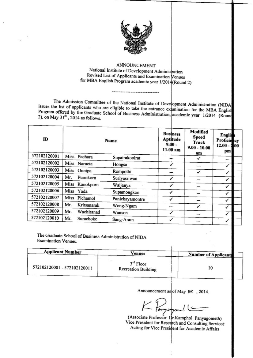 ANNOUNCEMENT: Revised List of Applicants and Examination Venues for MBA English Program academic year1/2014 (Round 2)