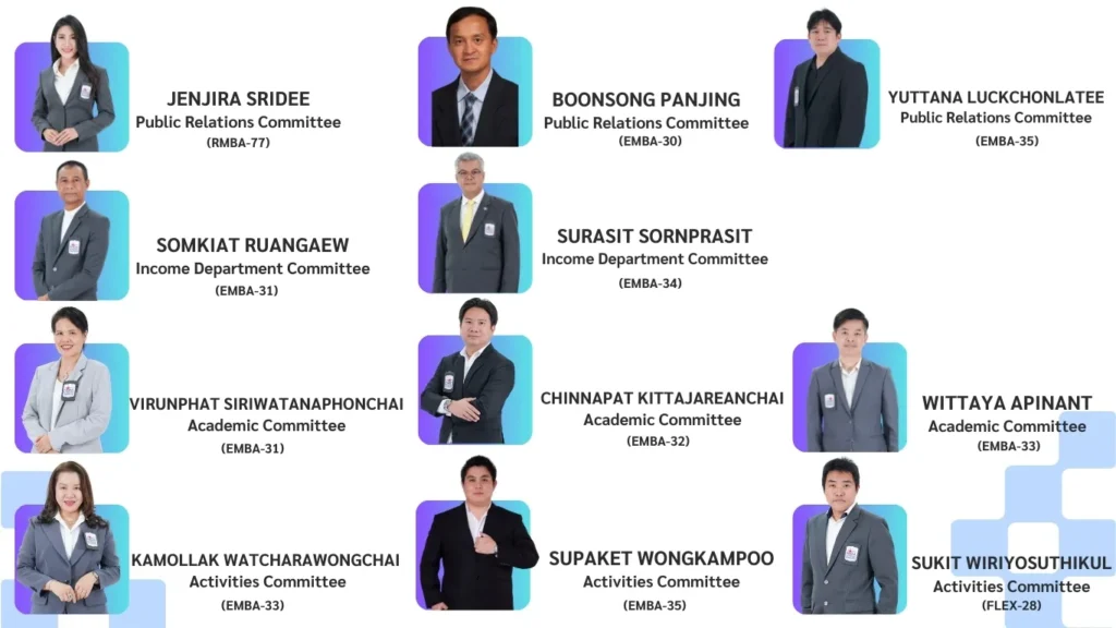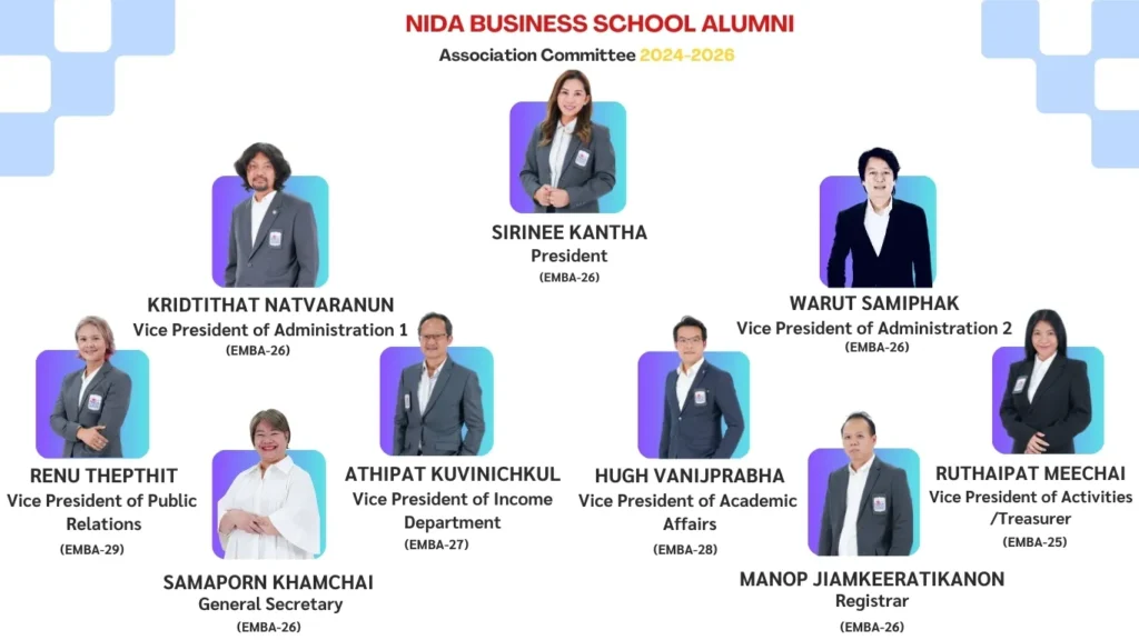 The Alumni Association was founded by Assoc. Prof. Dr. Nikorn Watthanaphanom, Dean of Faculty of Business Administration National Institute of Development Administration. He had joined with his fellow and alumni in both regular and special programs. They had devoted their physical resources, financial resources and self-sacrifice which extreme valuable to found the association for alumni of the Faculty of Business Administration to have alumni association of institutions with love and pride like other higher education institutions. The Association was authorized to register as a juristic person on April 7, 1993, with the election of its president by members voting every 2 years.