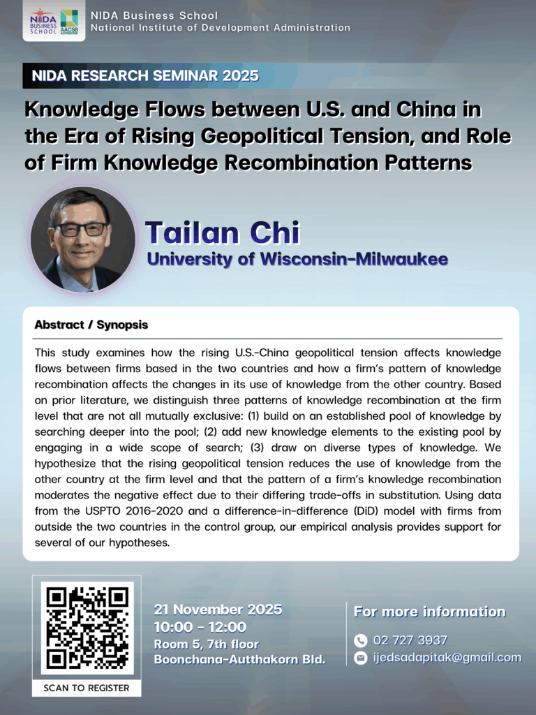 New! NIDA Business School will be hosting a research seminar on “ Knowledge Flows between U.S. and China in the Era of Rising Geopolitical Tension, and Role of Firm Knowledge Recombination Patterns ” The workshop will be held on 21 November 2025.