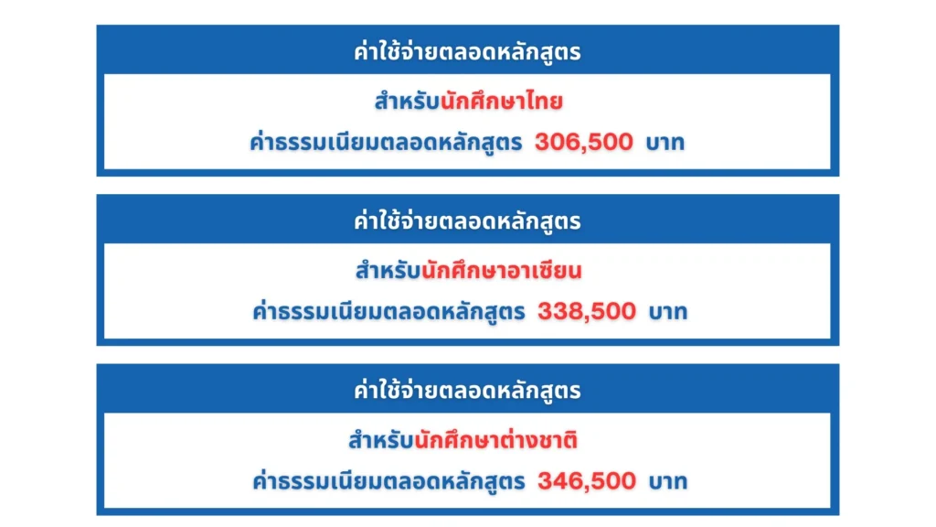 | 10.ค่าใช้จ่ายทั้งหมด (ประมาณ) | 306,500 บาท (สำหรับนักศึกษาไทย) 338,500 บาท (สำหรับนักศึกษาอาเซียน) 346,500 บาท (สำหรับนักศึกษาต่างชาติ) | 306,500 บาท (สำหรับนักศึกษาไทย) 338,500 บาท (สำหรับนักศึกษาอาเซียน) 346,500 บาท (สำหรับนักศึกษาต่างชาติ) |